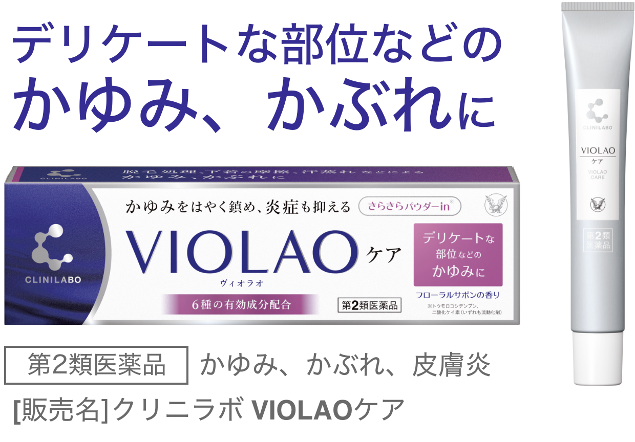 原因にかかわらず、かゆいからといって、肌をかきむしると、様々な肌トラブルを引き起こし、症状を悪化させてしまう可能性があります。かゆみを感じたら、「クリニラボ VIOLAOケア」がおすすめです。かゆみを抑える成分に加え、炎症を抑える成分も配合しています。