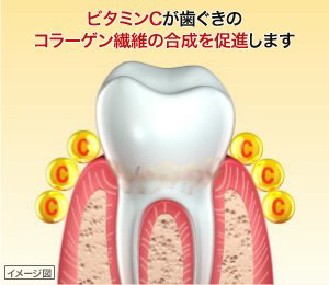 ビタミンCには「コラーゲン合成促進効果」があり、壊れたコラーゲン線維の再生を促し、歯ぐきを健康に保ってくれるのです。