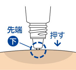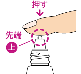 ●使用前に、容器の先端を上に向けて、手の指で押して中の空気を抜いてください。(暑い時期、温度の高い場所に置かれた場合や薬液が少なくなった場合などに、内圧が高まり薬液が多くでることがありますので、これを防ぐためです)